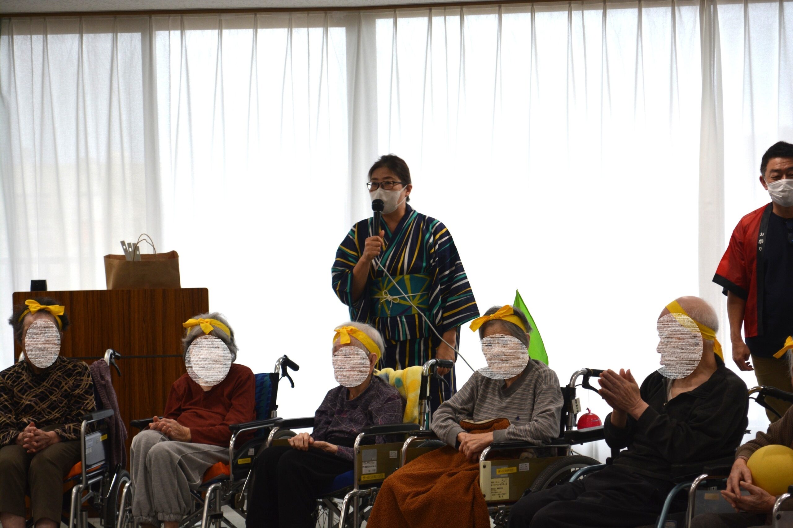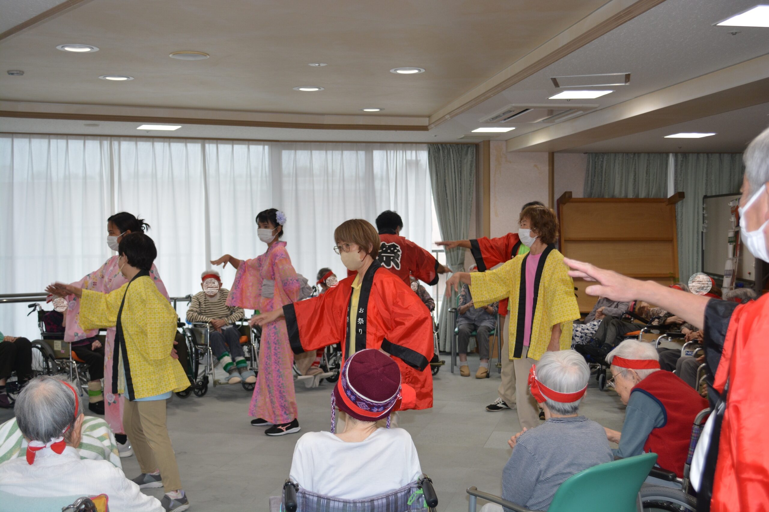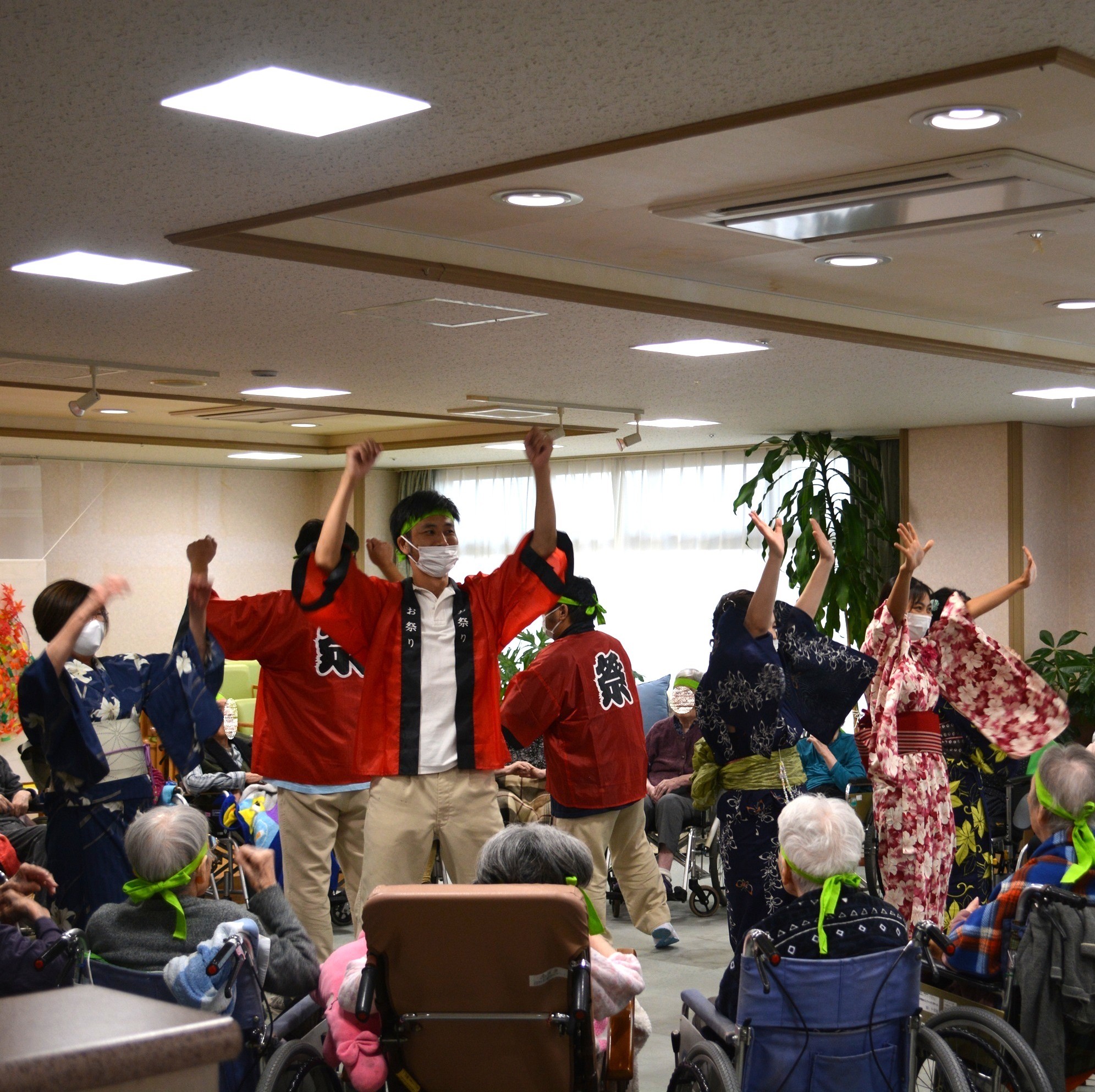フロア対抗戦のボール回し!熱戦の結果、優勝は3Fチームでした!熱戦後は、職員によるソーラン節です!ご利用者様も一緒に踊って楽しみました♬